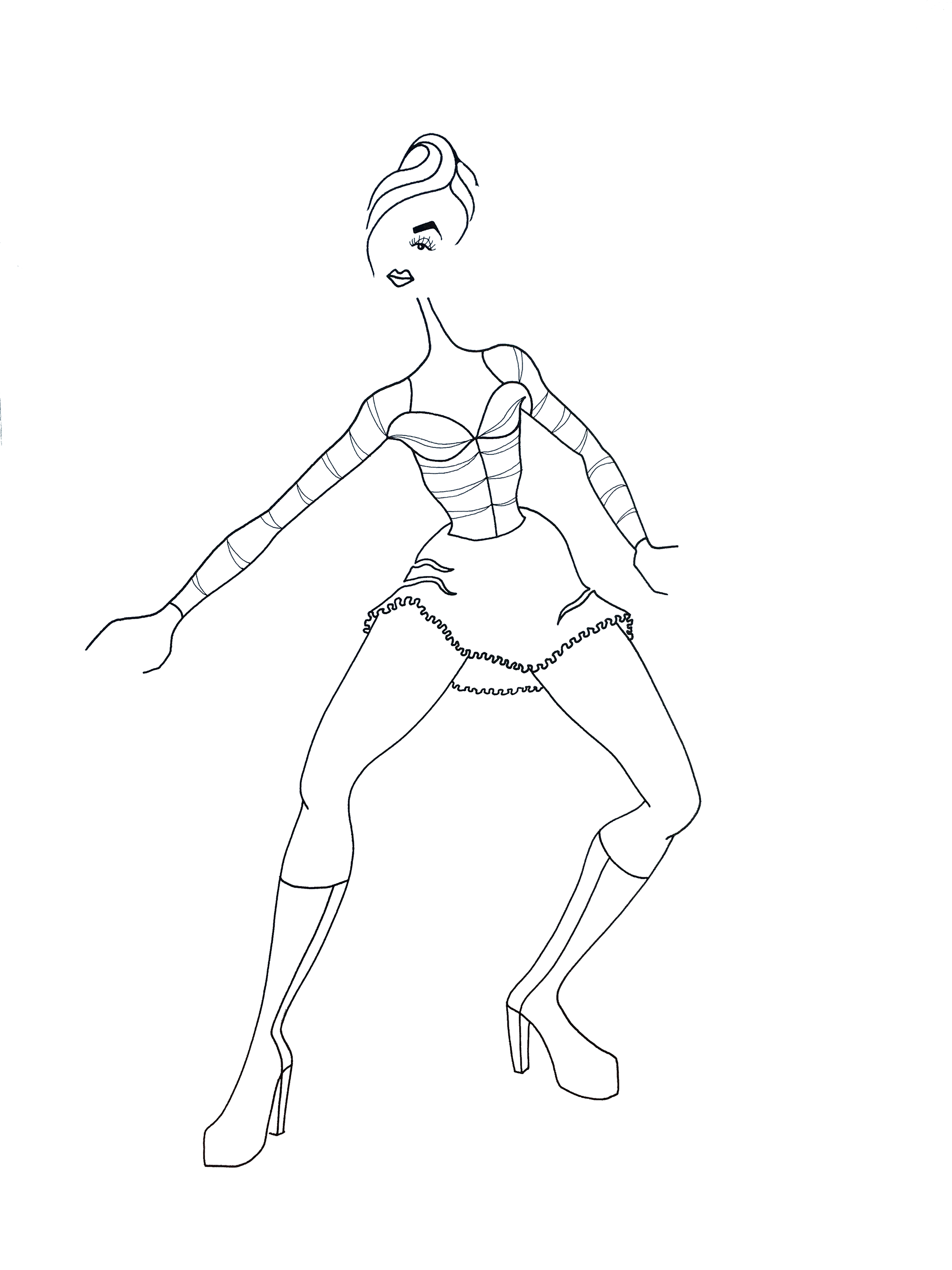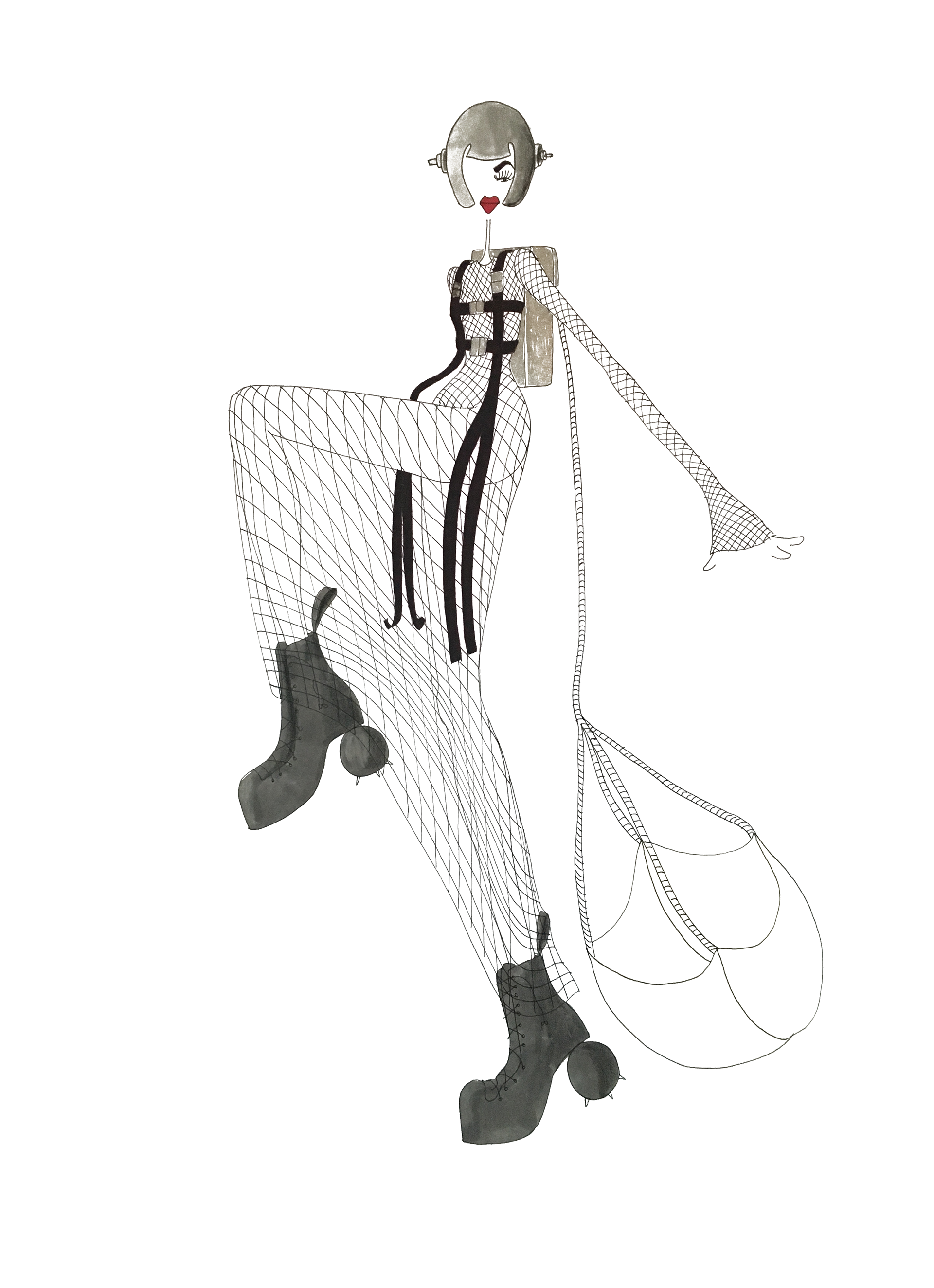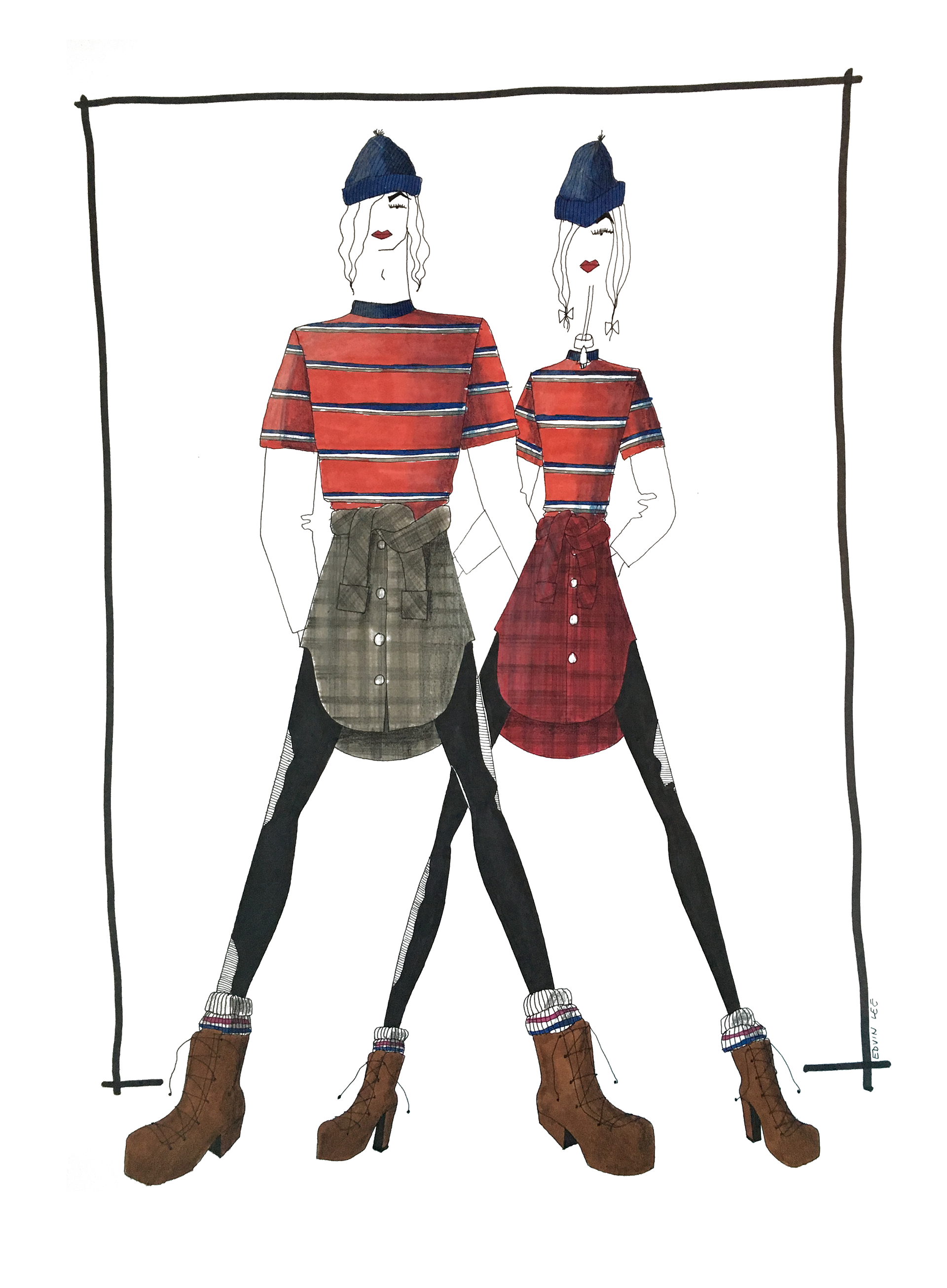 A selection of stylized hand-drawn fashion illustrations of various collections, using ink, pencil crayons and markers. The designs were inspired by different periods of style in the 20th century.