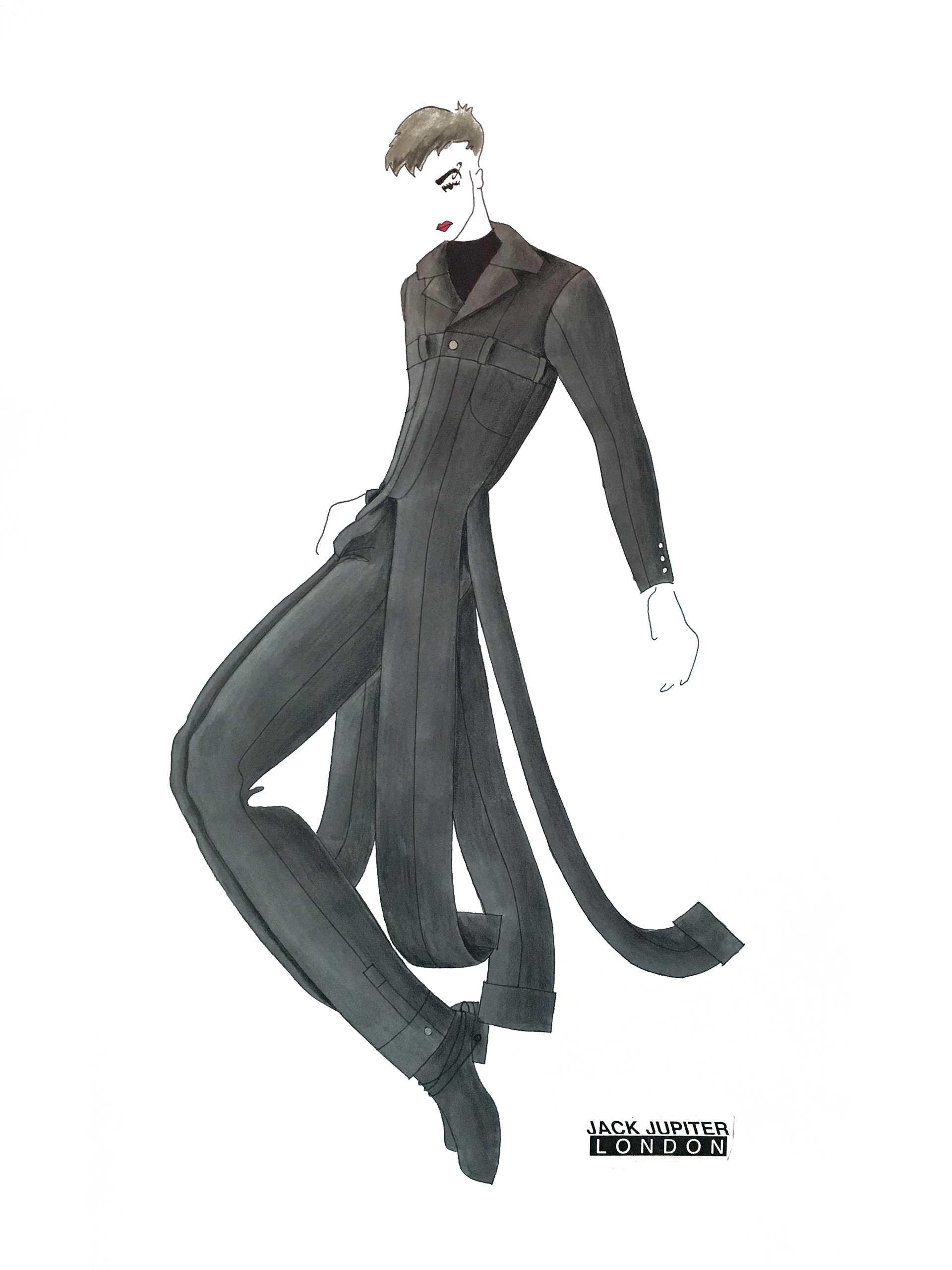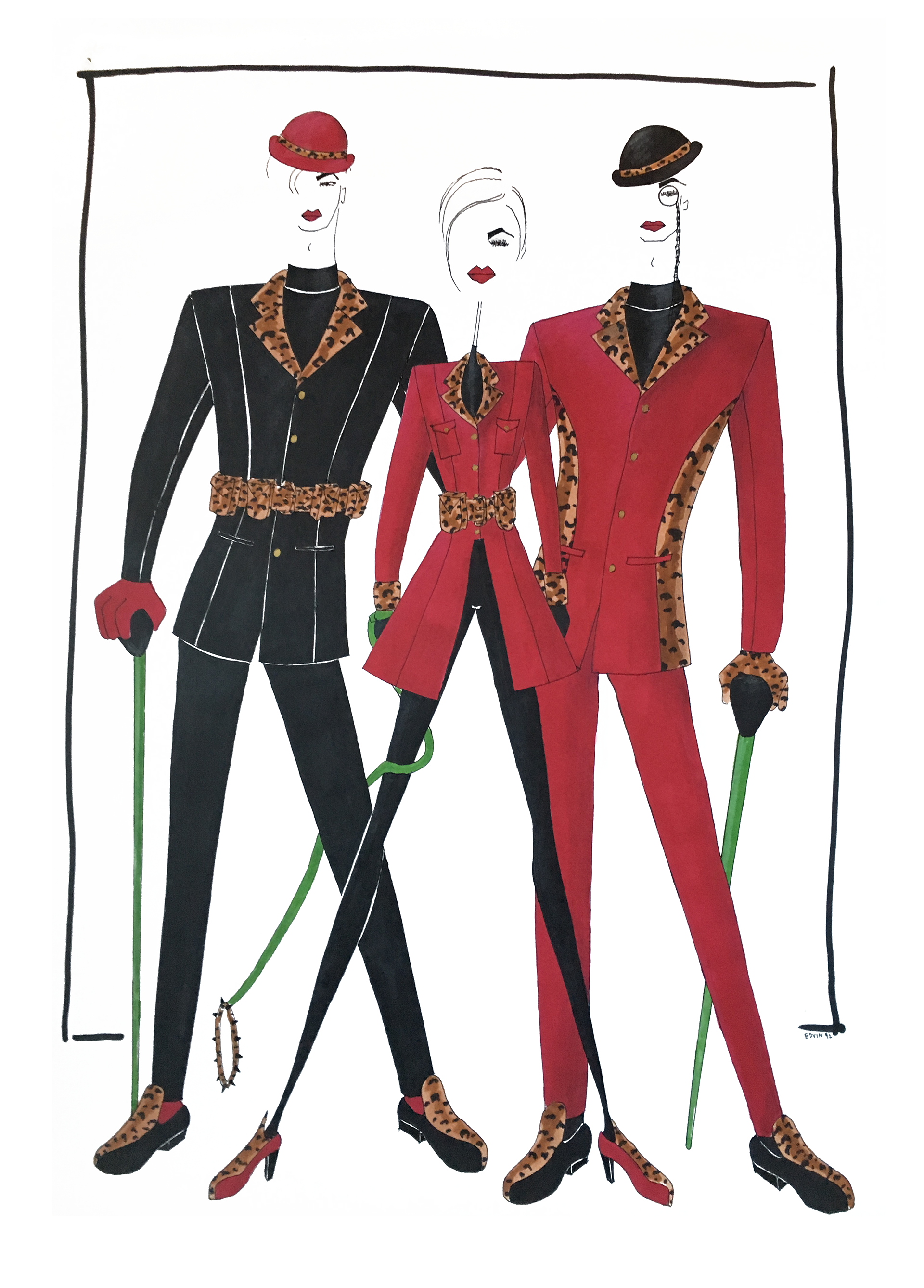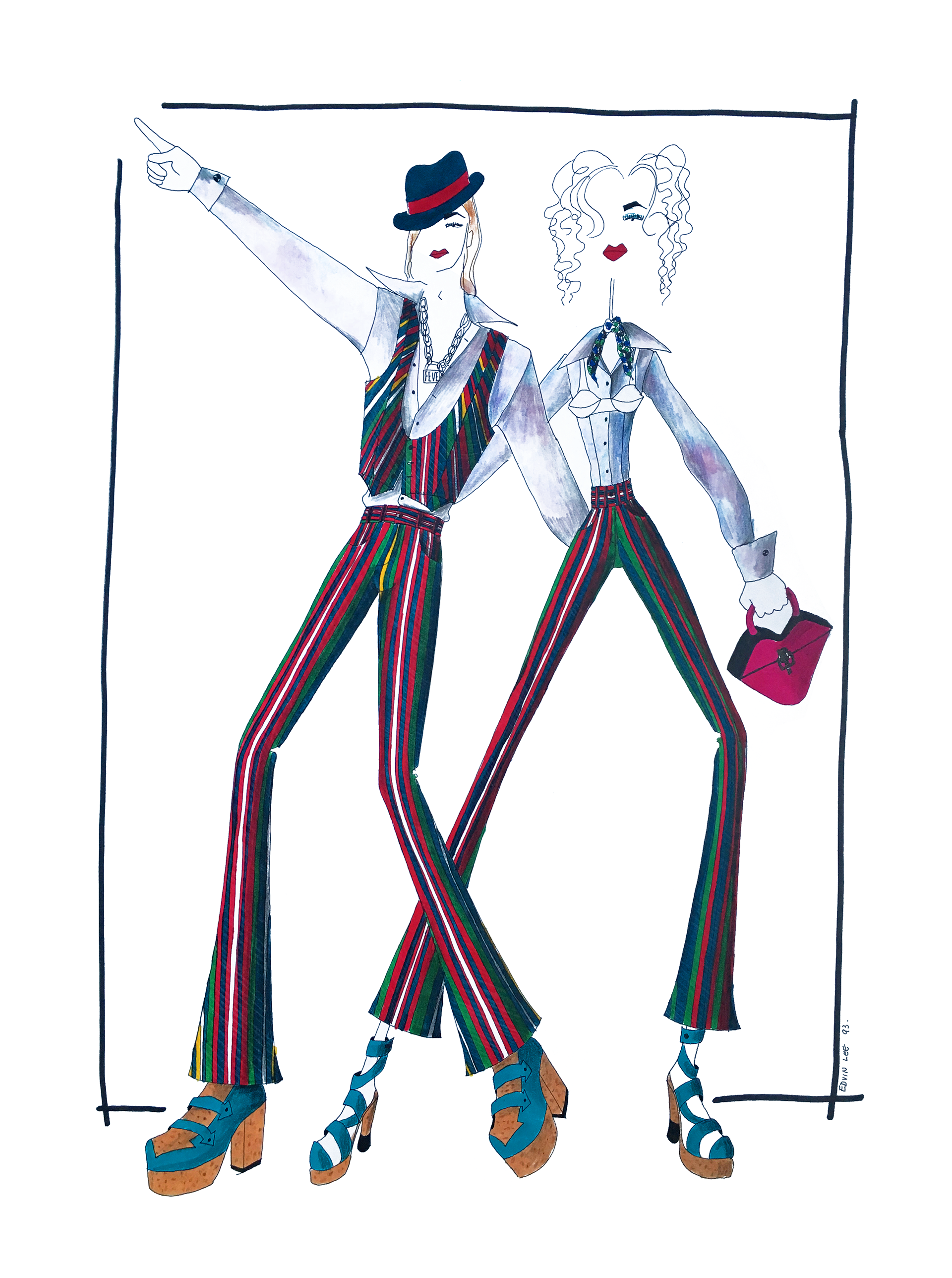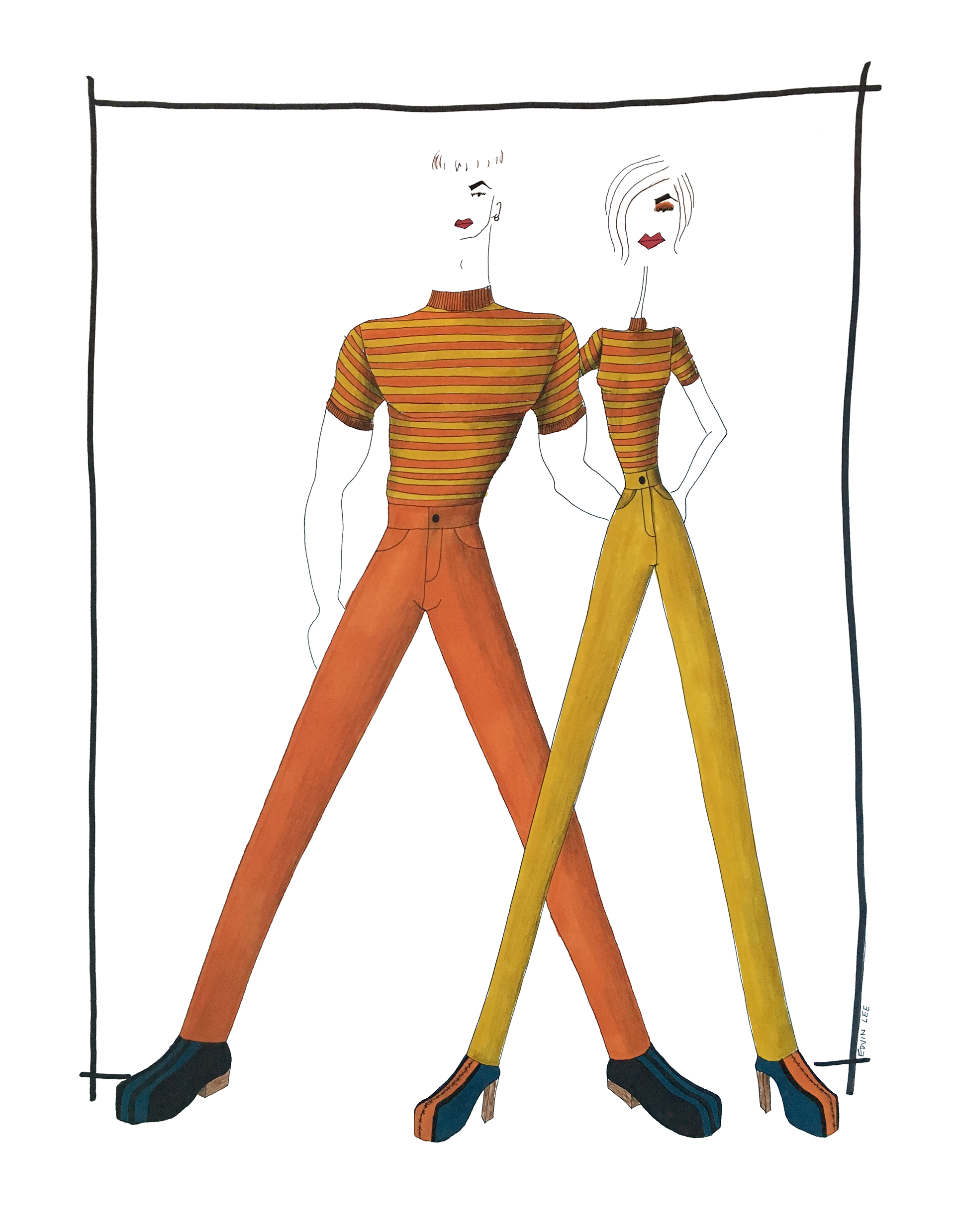 A selection of stylized hand-drawn fashion illustrations of various collections, using ink, pencil crayons and markers. The designs were inspired by different periods of style in the 20th century.