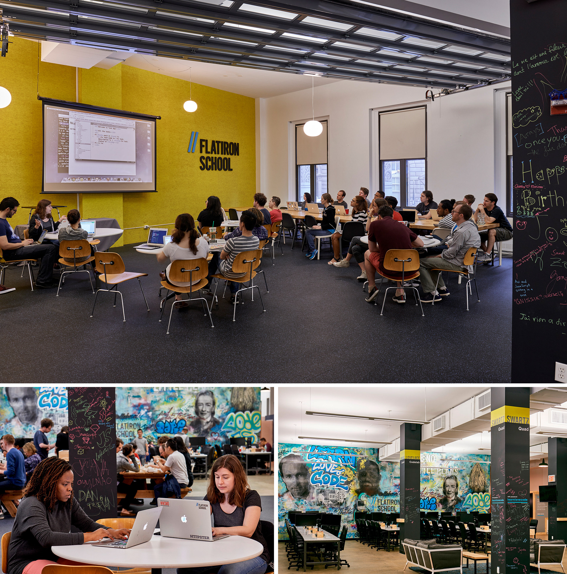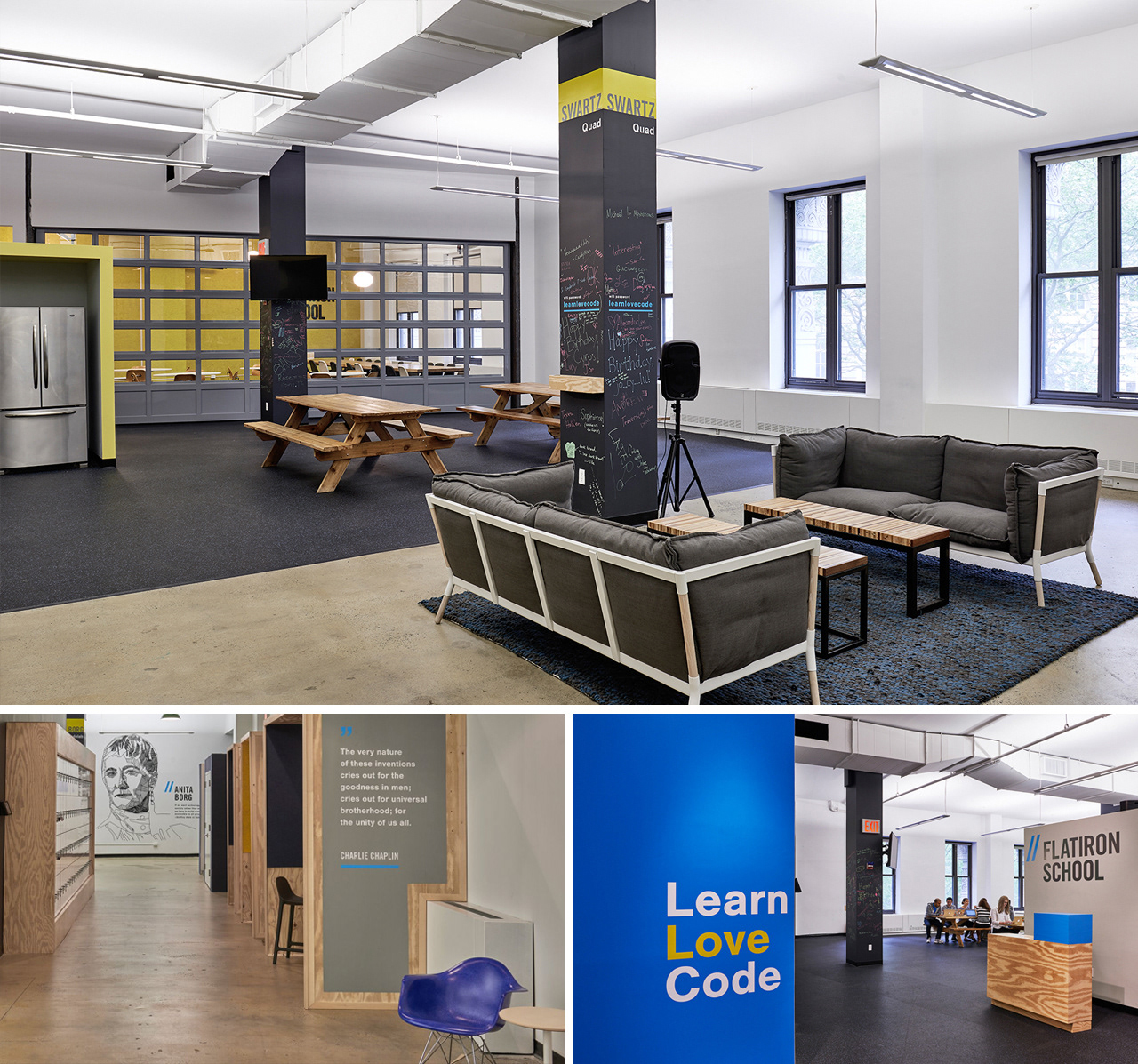 The finished design has a contemporary feel and friendly ambiance delivered through simple materials and striking graphic installations. The revamped campus's centerpiece is a collaborative graffiti wall created by students, staff, and NYC street artists. The mural reflects the brand's ethos and ideals and inspires past, present, and future students of coding power. The outcome represents diversity and collaboration.