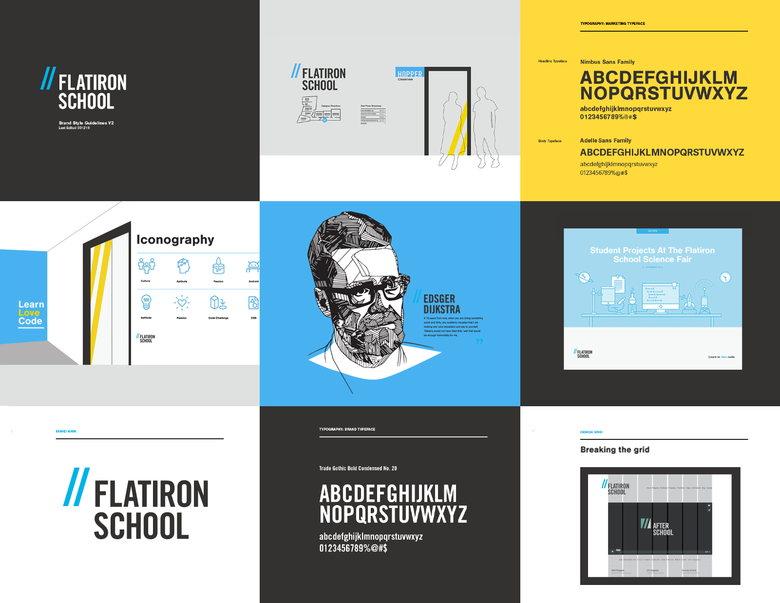 The branding must reflect Flatiron's values, including diversity, rigor, and inspiring creativity. The team had a limited time to complete the re-launch, and the conflicting values made it difficult to communicate effectively within a single brand mark. A solution was devised by applying rigor and hard work values within the brand mark and the design language to "inspire creativity."