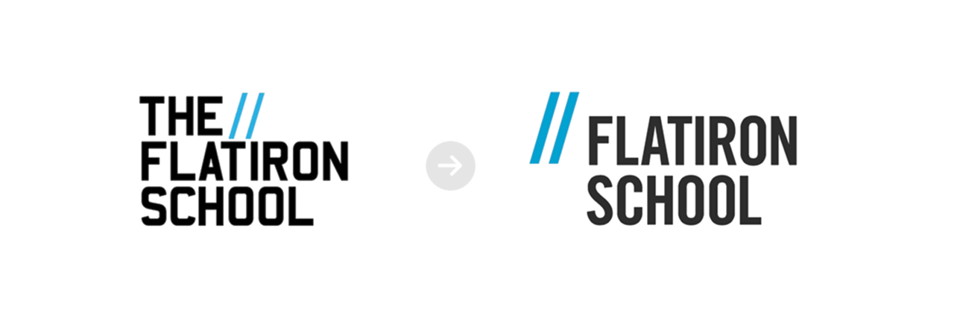 The "double slash" icon leads into the updated wordmark, extending beyond the word Flatiron. This visually breaks the design grid and emphasizes the rule-breaker metaphor in the brand's values. The slashes create a visual upward motion leaning on the wordmark that suggests 'Flatiron School will elevate you higher.' The reconfiguration of the slashes mimics the way developers write code. The team decided to simplify the brand by removing 'The' in the lockup.
